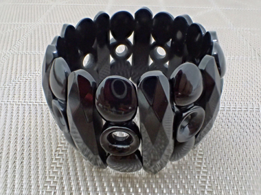 ジェットファン待望のバングルです。バングル製作で最も困難なのはまず原石の選定です。腕輪は何度も着けたり外したりしますから、強度が大事です。保つためには良質なジェット原石からしか彫刻できません。今春、ハイクオリティーでアンティーク調のバングルが出来上がりました。半袖のニットと合わせたら素敵ですね。