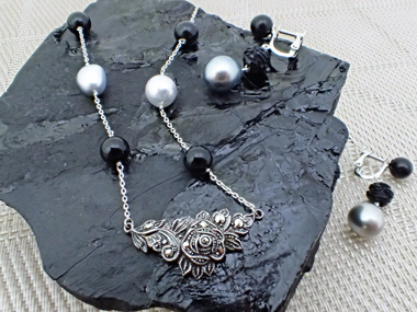 アンティークのマルカジットパーツとプラチナチェーン、ジェット、黒蝶パールを組合せた素敵なチョーカーとペアのイヤリング。夏の装いにいかがでしょう。